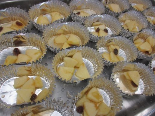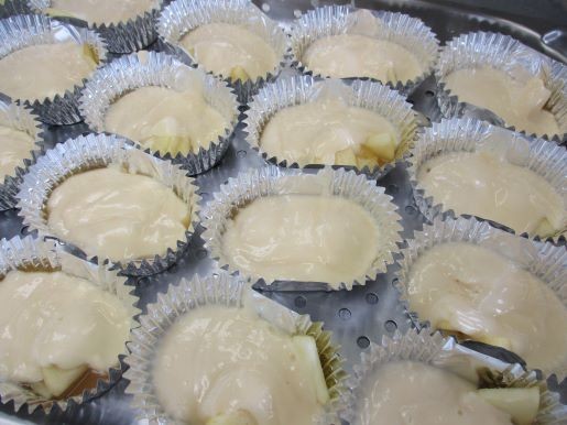 アルミカップにりんごを分けておき、上から生地を流し入れます。