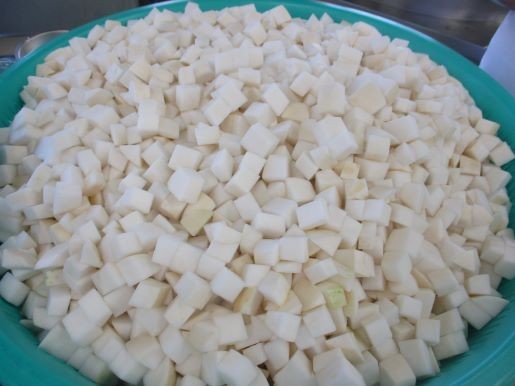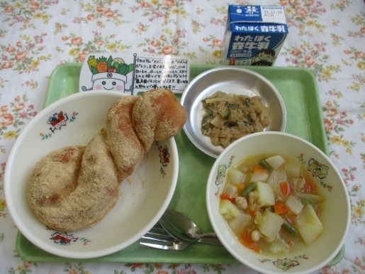 20日の給食は、きなこ揚げパン、かぶ入りポトフ、だいこんとツナのサラダ、牛乳です。20日は今が旬の「かぶ」をたっぷり使った「ポトフ」を作りました。「かぶ」は白いもの、赤いもの、小さいもの、大きいものと様々です。根っこの白い部分だけでなく、大根と同様、葉っぱの部分も食べることができます。寒い時期に甘みが増してきます。
