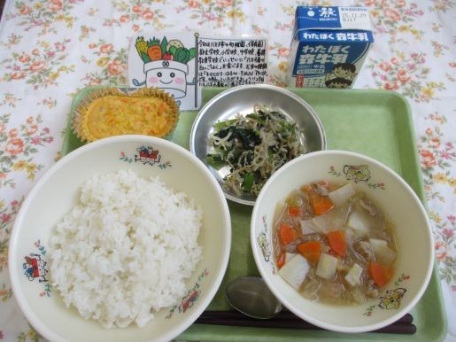 21日の給食は、八王子産の白いごはん、卵焼き、小松菜のじゃこ炒め、はっちくんのみそ汁、牛乳です。この日は「八王子産の白いごはんを食べる日」で、市内保育園、幼稚園、都立学校、小学校、中学校、義務教育学校でいっせいに「八王子産の白いごはん」を食べました。高月町、元八王子町、川口町、長沼町で作られました。お米の銘柄はキヌヒカリ、はるみ、キヌムスメ、アキニシキです。八王子市のお米は「ごはん」として食べるほか、日本酒の材料にも使われています。米農家 石川 研さんからメッセージをいただきました。