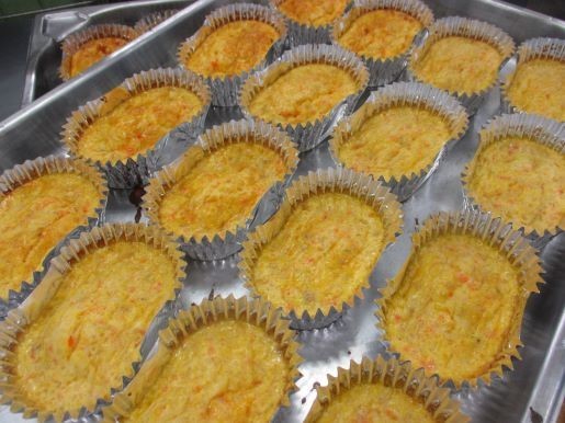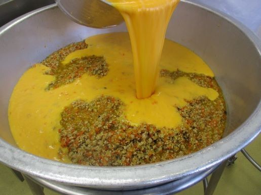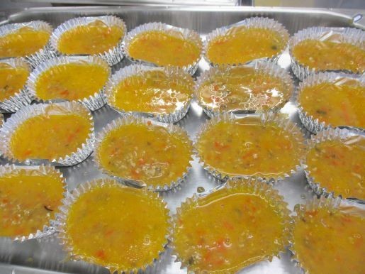 卵焼きは手作りです。炒めて味をつけ、冷ました具にたまごを流し入れます。アルミカップにたまごと具が平均にいきわたるように注ぎます。スチームコンベクションオーブンでふっくらこんがり焼いたら出来上がりです。箸では食べづらいので、スプーンもつけました。
