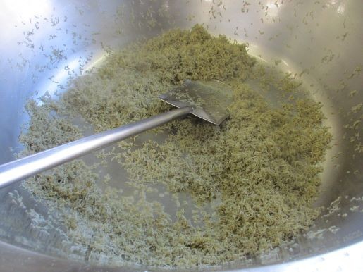 小松菜をたっぷり使いました。切りやすいように茎をそろえて切ります。ちりめんじゃこもたっぷり使います。よく炒めて味つけます。