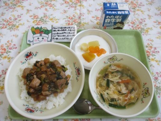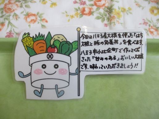 26日の給食は、はち大根と豚の角煮丼、中華スープ、フルーツヨーグルト、牛乳です。この日は「八王子産大根」を食べる日2回目です。大根は涼しい気候で育つ、冬が旬の野菜です。種をまく時期や産地を工夫し、今ではお店で一年中出回っていますね。八王子でも「春大根」「秋冬大根」がたくさん作られています。