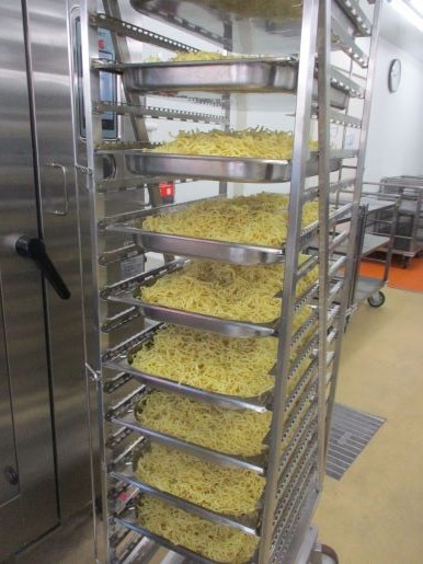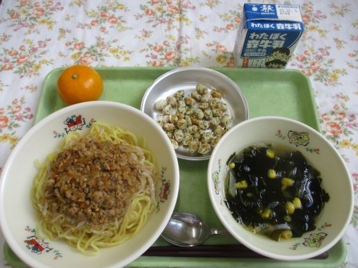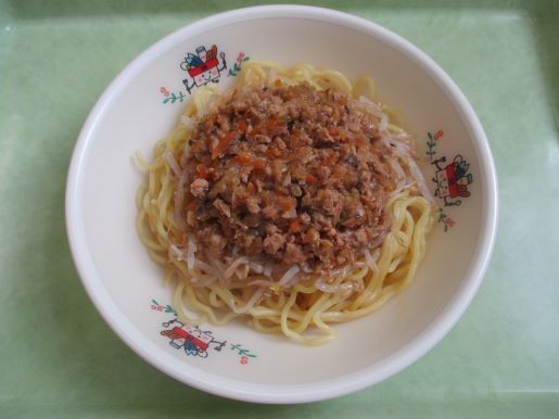 27日の給食はジャージャー麵、わかめスープ、ポップビーンズ、果物(みかん)、牛乳です。ジャージャー麵に使われた蒸し中華麺はなんと97キログラム!この麺をスチームコンベクションオーブンでふっくら蒸かします。ジャージャー麵も大人気のメニューです。「今日の給食は?」という質問に「ジャージャー麵だよ!」と答えるとほぼ全ての子が「やった!!」と喜びます。麺の上にもやしのナムル、その上に具をのせて、完成です!!