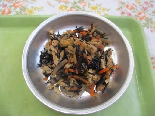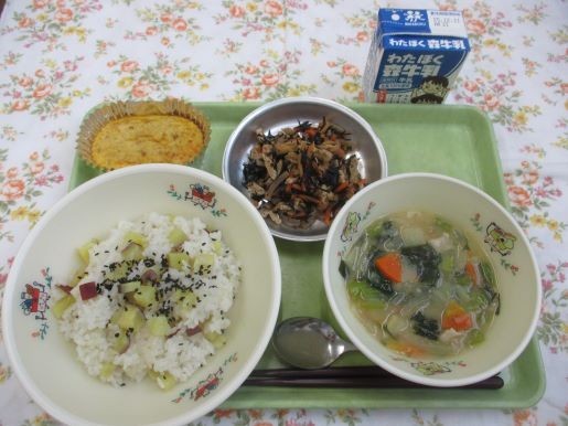 3日の給食は、さつまいもごはん、厚焼き卵、ひじきの炒め煮こんにゃく入り、具だくさんみそ汁、牛乳です。代表的な和食献立となりました。昨日の給食が児童のみなさんに最も好まれる給食だっただけに、残り具合が気になりましたが、とてもよく食べてくれていました。ひじきの炒め煮も「食べてほしい献立の一つ」であることを給食委員会のみなさんが放送してくれたことも理由の一つかもしれません。厚焼き卵も食べやすいようにスプーンをつけています。