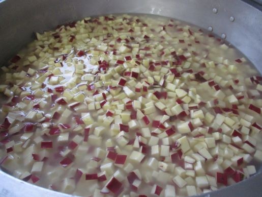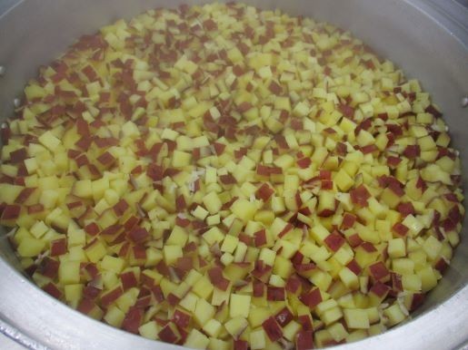 さつまいもごはんには、たっぷりの「八王子産さつまいも」を使いました。しっかり洗浄し、皮付きのまま1cm角に切ります。炊飯釜へごはんとともに入れ、スイッチオン!!