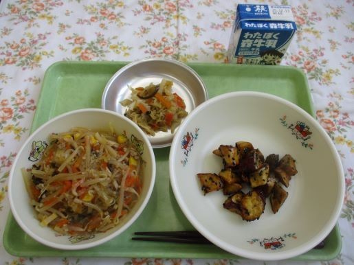 5日の給食は、みそラーメン、大学芋、スタミナ野菜、牛乳です。今日も大人気のメニューでした。お芋が出たので、牛乳の残りがとても少なかったです。