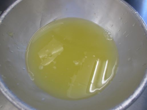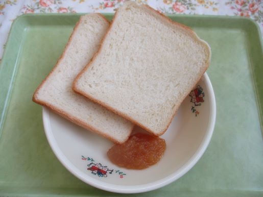 今日のパンは国産小麦を使った食パン2枚で、手作りりんごジャムをはさんで食べます。日本で小麦が一番多く作られているのは「北海道」ですが、食料自給率はお米約100パーセントに対して、約18パーセントと低く、約82パーセントを海外からの輸入に頼っています。国内で作ったものを食べることは、物を運ぶ時のエネルギーが少なくすむので、「エスディージーズ」の取組の一つ「CO₂削減」にもつながります。手作りりんごジャムは甘いたくさんのりんごをすりおろし、国産レモンを絞って加えます。教室ではパンが2枚あるので、1枚はりんごジャムをつけて、もう1枚はポークビーンズをつけて食べていました。この日の全ての献立の残りが非常に少なかったです。