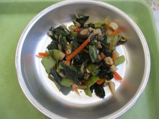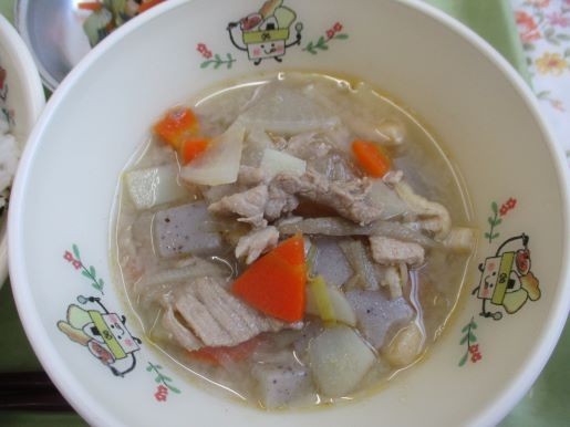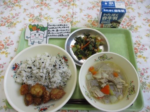 12日の給食は、わかめごはん、ホキのごまがらめ、小松菜の和え物、豚汁、牛乳です。久しぶりの和食で、しかも縦割活動が行われるため、少々忙しい時間割でしたが、残りが非常に少なかったです。