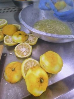 本日は「冬至献立」で小津町産ゆずを使った「さわらの幽庵焼き」を作りました。小津町産のゆずの皮をむいて千切にします。果汁も絞り、さわらの下味に加えます。