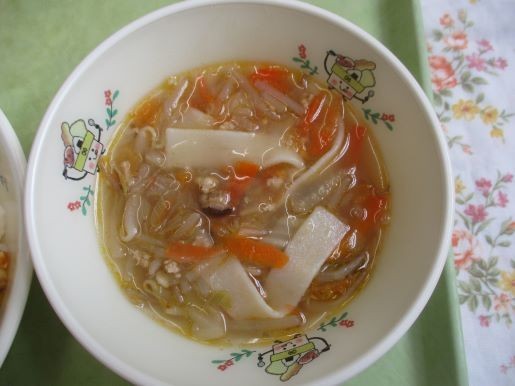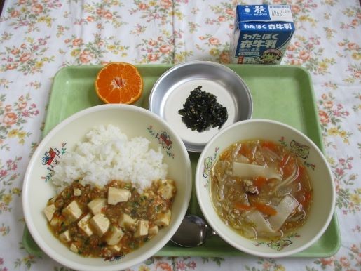 20日の給食は、ごはん、マーボー豆腐、わかめのにんにく炒め、ワンタンスープ、果物(みかん)、牛乳です。給食のワンタンスープの「ワンタン」は中身がなく、皮のみです。スープに加えると「トロっ」として、滑らかな食感になります。人気メニューの一つです。