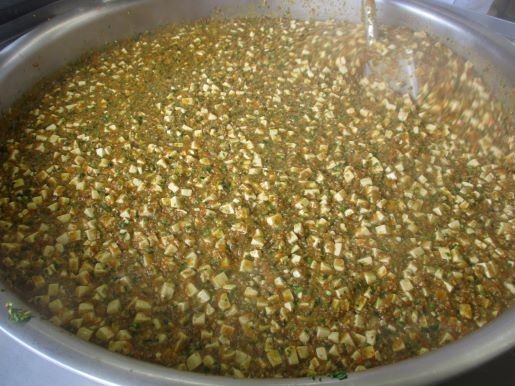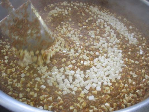 良く煮込んだ「具」の中に熱々の豆腐を崩さないように入れて、かき混ぜ、温度を上げたら出来上がりです。1年生から6年生までが食べるので、できる限りマイルドに作っています。今日の献立も全て残りが少なかったです。