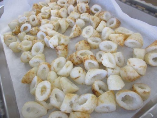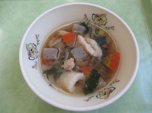 きりたんぽを小さめに切り、一度こんがり焼いて、汁に入れました。心も体も温まるおいしい「きりたんぽ汁」でした。