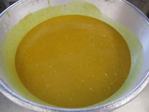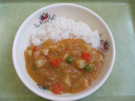 「おいしく手作り」です。給食は安全を確かめた食材を使って、毎日調理しています。カレー・シチューの「ルー」やハンバーグなども加工品を使わずに調理員さんの手作りです。この日のカレールーも材料はたったの4つ!!「小麦粉、カレー粉、バター、油」です。余計なものが入っていないので、安全でおいしく出来上がります。