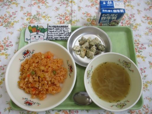 28日の給食は、大豆ピラフ、チキンのハーブ焼き、オニオンスープ、牛乳です。全国学校給食週間3日目です。三日目のキーワードは「う」