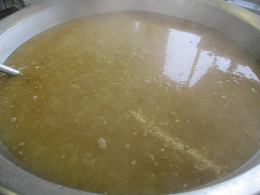 国産豚肉使用無添加ベーコンも炒め、33キログラムに変化した「あめ色たまねぎ」を加えてさらに、けずりぶしでとった「だし」を加えて、さらに煮込みます。塩、こしょう、しょうゆで味を調えたら完成です。甘みがあり、心温まる「オニオンスープ」でした。