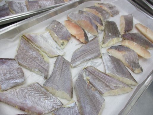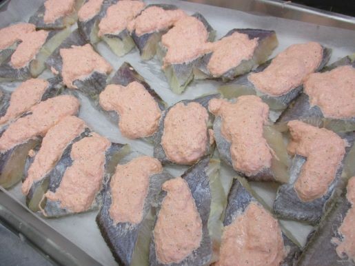 魚は「ホキ」を使いました。ホキの上にソースをのせて焼きます。ピンク色のように見えたソースが焼き上がりは、きれいな夕焼け色に仕上がりました。