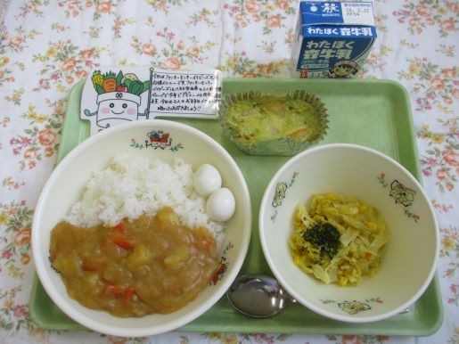 4日の給食は、ファンキーモンキーベイビーズ元気応援メニューのファンモン★エッグカレー、ベイビーズ太陽サラダ、桑の都クラフティー、牛乳です。ファンキーモンキーベイビーズ(通称ファンモン)は八王子市出身の2人組音楽グループで、今年でデビュー20周年を迎えます。大好きな地元を巡る「桑の都ツアー『全八』」などを行い、音楽を通して八王子を盛り上げています。