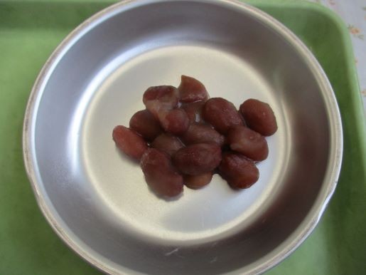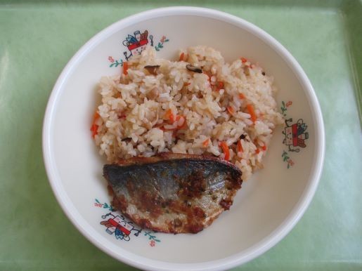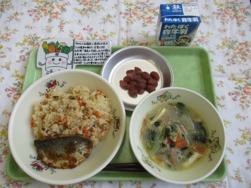 5日の給食は、きのこごはん、あじの辛味焼き、八王子産米の粕汁、金時豆の甘煮、牛乳です。