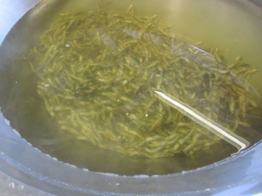 お米を発酵させて作った「もろみ」をしぼると、お酒と酒粕ができます。粕汁は酒粕を加えて野菜を煮た「汁物」です。この日のだしは「煮干し」でとりました。異物がないか、しっかり確認して、使用します。