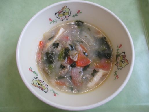 日本酒「高尾の天狗」は八王子産のお米100パーセントで作られたお酒です。この日本酒を作る時にできた「酒粕」を給食で使い、「粕汁」を作りました。お米の種類は「八王子高月清流米」と「ひとごこち」です。