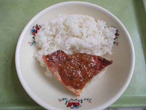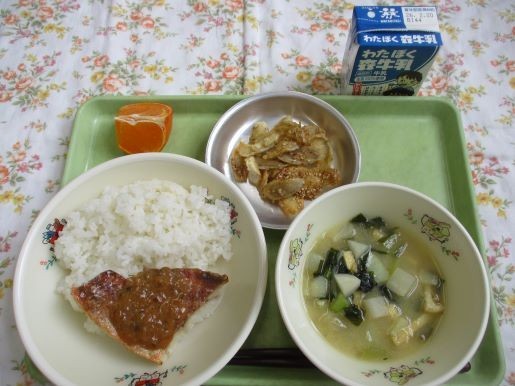 12日の給食は、ごはん、赤魚のねぎ味噌焼き、甘辛ごぼう、みそ汁、果物(せとか)、牛乳です。