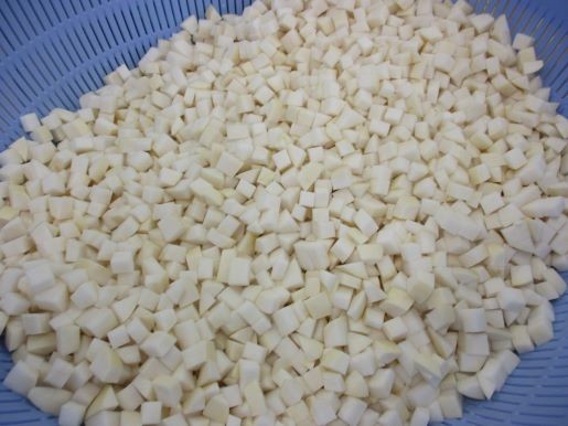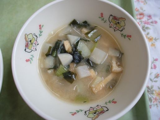 みそ汁に「かぶ」を入れました。すぐに火が通って柔らかくなるので、形を角切りにして、仕上がり直前に加えます。