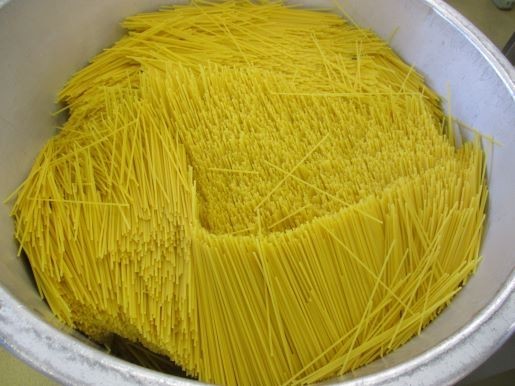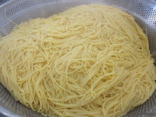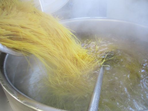 この日はカップケーキが出ることもあり、少なめのスパゲティー(50キログラム)を3回に分けて茹でます。茹で時間は約10分。茹で上がったら熱したオリーブ油で和えて出来上がりです。