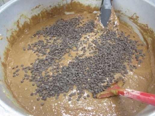 ココアカップケーキの生地を作り、最後に八王子産米粉を加えて、さっくり混ぜます。手早く混ぜないと、バターが寒さで固まり、米粉の粘り気が出てきてしまいます。