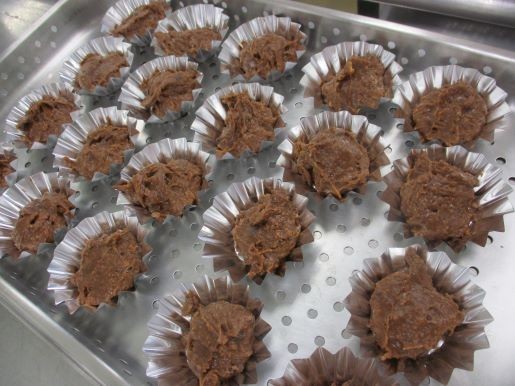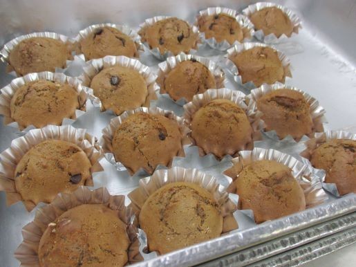 アルミカップに分けて入れ、スチームコンベクションオーブンでふっくらこんがり焼いたら出来上がりです。米粉が入っているので、外側さっくりと中側ふんわりと仕上がりました。