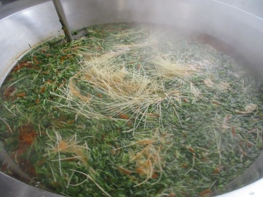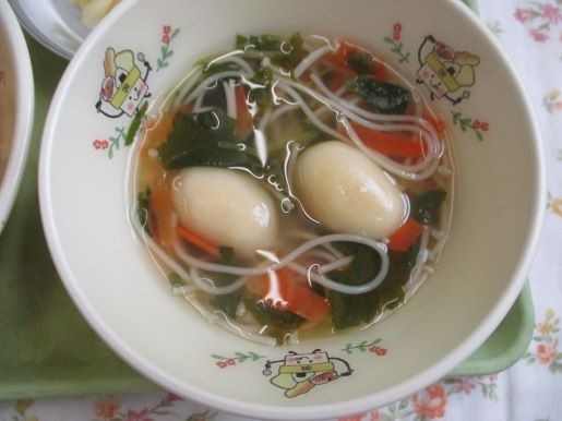 出来上がった汁に一人2個の繭型白玉を入れたら完成です。とてもかわいらしい繭玉白玉で、見た目もおもしろい絹のお吸い物に仕上がりました。教室では白玉をよく噛んで食べることの注意喚起が行われていました。