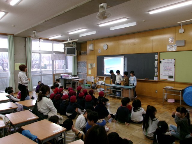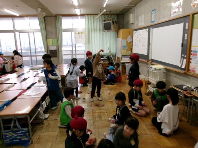 学校の紹介と昔遊びを通して交流を深めていました。