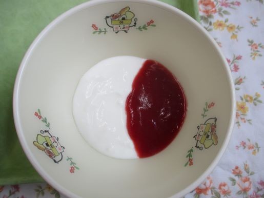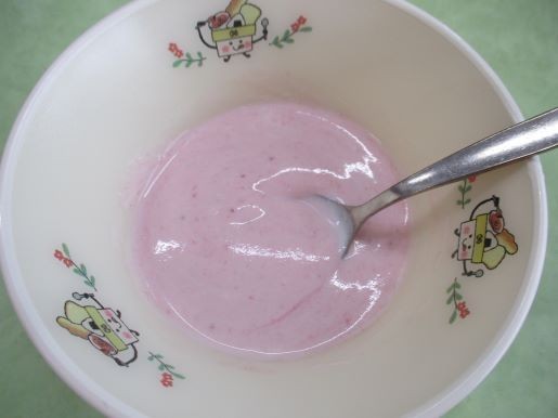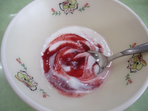 「ピンクシャツデー」にちなんで、給食では手作りのイチゴソースをヨーグルトともにいただきました。スプーンでぐるぐる混ぜてみるときれいな「ピンク色」になりました。