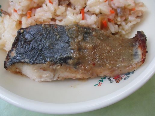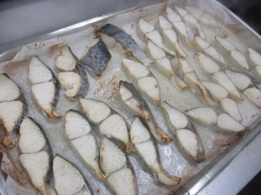 魚は「鰆(さわら)」を使いました。脂がのっておいしい鰆です。上から「ごまみそだれ」をかけるのですが、下味にも「みそ」を使っています。鉄板に並べて、オーブンでふっくら、こんがり焼きます。上から「ごまみそだれ」をかけたら、出来上がりです。ごはんがすすむ、利休焼きでした。