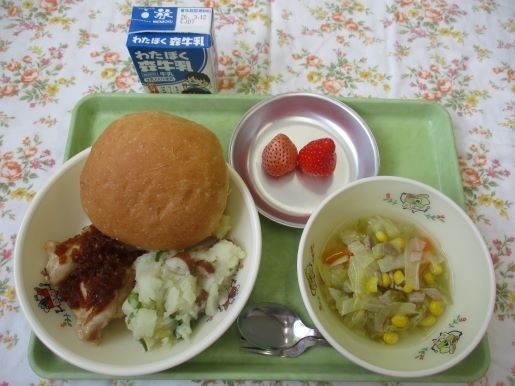 4日の給食は「七国小学校ドリーム献立」のチキンステーキサンド、ジャーマンポテト、キャベツとベーコンのスープ、果物(紅白いちご)、牛乳です。