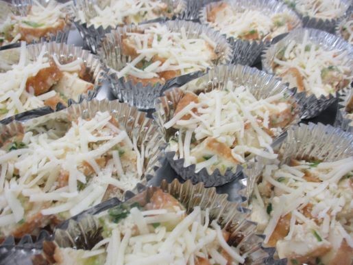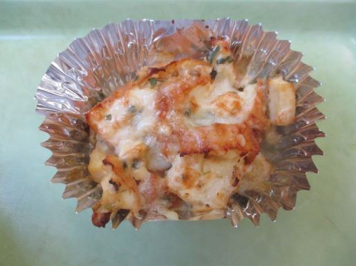 アルミカップに分け、上からチーズをのせてオーブンでこんがり焼いたら出来上がりです。見た目から「おいしいのかな?」と思われがちですが、食べるととても美味しいので、先生方にも「食べてみるとおいしいよ!」と声をかけていただいています。調理員さんも一押しの献立です!!
