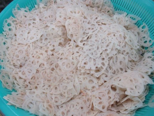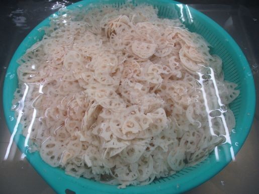 れんこんは22キログラム使いました。大きく立派だったので、半分に切って、スライスしました。水にさらし、その後しっかり水気を切ります。