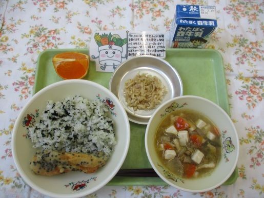 11日の給食は、「防災を学ぶ献立」の三陸わかめごはん、ささかまぼこの南部揚げ、八杯汁、切り干し大根とツナの炒め煮、牛乳です。