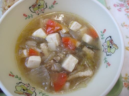 三陸わかめ、ささかまぼこ、八杯汁は東北地方の食材、料理です。防災を意識して食べました。保存年限の長い食材を災害に備えて購入して保管しておくことを「日常備蓄」と言います。三陸わかめごはんには八王子市の備蓄米(アルファー化米)を使用しました。