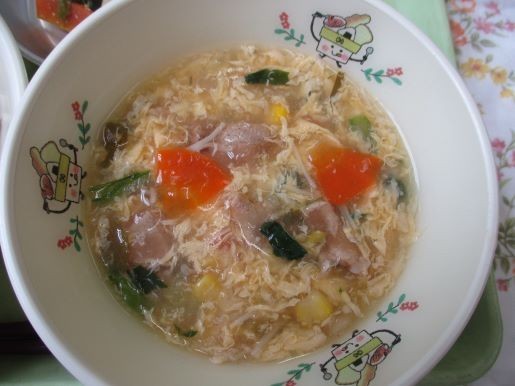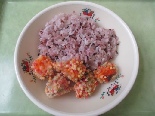 16日の給食は「滝山城御膳」の氏照ごはん、魚の桜風あられ揚げ、小田原かまぼこのごま和え、寄居町のトントロリンスープ、牛乳です。