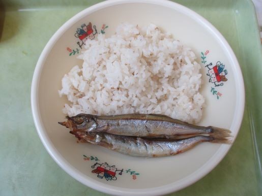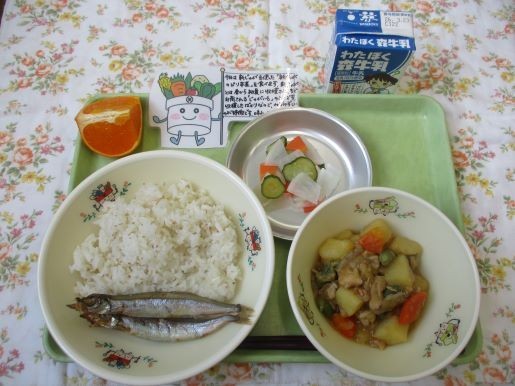 17日の給食は、ごまごはん、焼きししゃも、新じゃがのぴり辛煮、浅漬け、果物(せとか)、牛乳です。ししゃもは頭から尾まで、全て食べることができます。できる限り残さず食べてほしい食材の一つです。