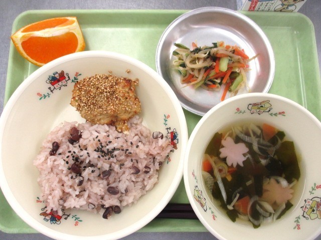 ★今日の給食は、1年生の入学と2~6年生の進級をお祝いしたメニューです。お赤飯を炊き、桜型のかまぼこを入れたすまし汁を作りました。