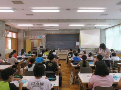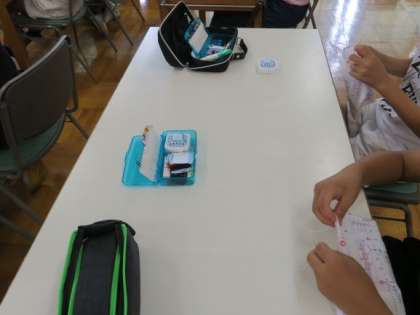 5年生が家庭科で「ひと針にこころをこめて」の学習をしています。写真は、なみ縫いの練習をしているところです。集中していました。