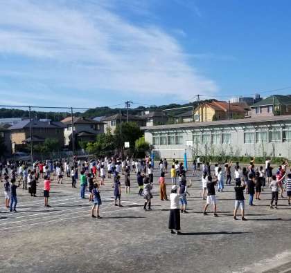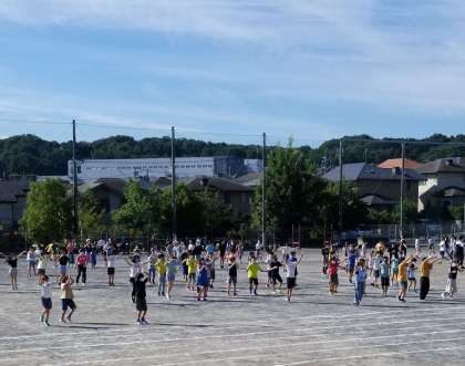 本日は、朝の時間に高学年の体力づくりの活動がありました。5・6年生の『ぼくらの八王子』は、動きが大きく見応えがあります。