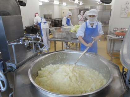 大きな釜いっぱいのみじん切りのたまねぎを炒めるところから