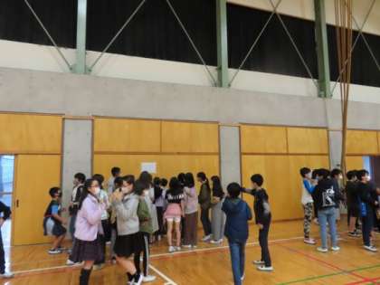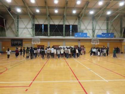 全員でダンスを踊って盛り上がってから、4人組で夜の校舎の中を歩きます。体育館に集まった6年生を見ると、ミステリーツアーを楽しみにしている様子が伝わってきます。