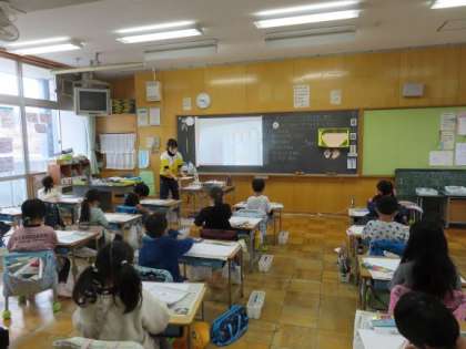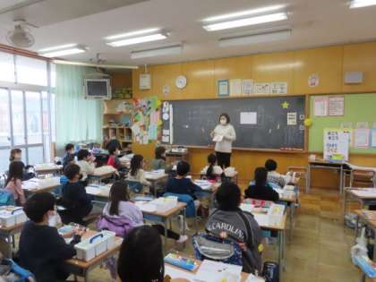 1年生が図画工作で「大きな口でいただきま〜す!」の学習をしています。今日は、絵の具で顔、手、背景を塗りました。写真は、絵の具を混ぜて顔や手の色をつくる方法を聞いているところです。