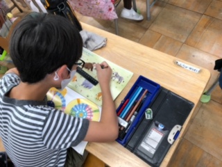 教科書の楽しいイラストで、定規の正しい使い方を学習しています。