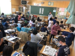 初めての毛筆、子供たちは真剣ながらも楽しみながら取り組んでいます。
