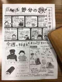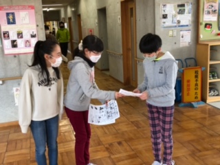 6年2組の新聞担当の子が、休み時間に自分たちで発行した新聞を通りがかりの教員や子供たちに配っていました。