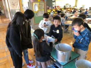 早めに休み時間となって通りがかった6年生が、片付けを手伝ってくれました。